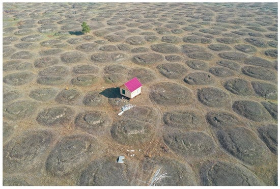 The largest area is covered by bylars, which are the initial stage of the formation of alases and belong to the modern forms of relief, which began to develop from the beginning of the 1990s []. They are formed as a result of the thawing of the upper part of wedge ice and represent a subsidence–polygonal microrelief. On the territory of Yunkyur, such landforms occupy an area of 0.4 km2, while in Amga, they occupy 6 km2. As a result of the analysis of the created schematic maps, it was revealed that the formation of the bylars was confined to local areas throughout the entire area of settlements. Their highest concentration in Yunkyur is concentrated in the north-western part of the village, in Amga, such territories are mainly concentrated in the north-eastern and north-western parts. In the village of Yunkyur, they form in the interlake spaces and on the sides of the lakes of thermokarst lakes, and outside it includes the territories of abandoned agricultural lands. In the village of Amga, these occur in the formerly arable lands, which were formed by uprooting the larch forest.