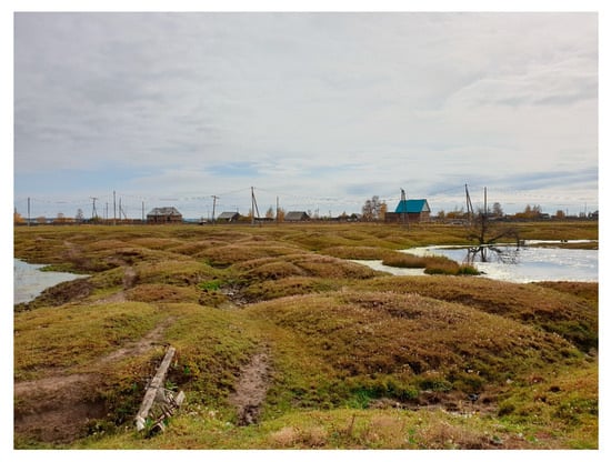 Thus, in the studied villages, the formation of primary forms of alas relief—bylars—is observed. They are formed in the areas of ice-rich permafrost and, therefore, cover a significant area in Amga. In addition, Holocene alas basins are widespread in the study areas, which may indicate possible consequences if the climate development and degradation of permafrost are not reversible [].