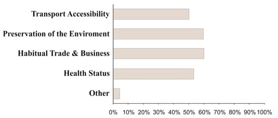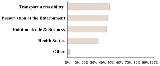 This problem is most acute in Amga. Here, in late July 2013, after heavy rains, there was a large landslide, which damaged the road connecting the village with the capital of the republic—Yakutsk. For about two weeks, residents of Amga were left with no traffic connection with the “outside world” and sufficient grocery supply. According to S. P. Gotovtsev, the landslide was primarily caused by permafrost thaw []. In this regard, it is evident why, according to the data of our survey, the inhabitants of Amga see the main threats from climate change impacts, first of all, affecting transport accessibility of their settlement (Figure 10).