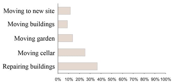 According to our data in Amga, 57% of respondents faced problems caused (in their opinion) by permafrost degradation (Figure 12). Meanwhile, in Yunkyur, this figure was 84% (Figure 13). In Amga, 30% were forced to repair and/or strengthen the foundations of the damaged structures. In Yunkyur, the figure was 36%. In addition, the Amga residents we interviewed were less likely to transfer vegetable gardens and buildings within their area. In the course of the survey, we did not record any cases of this kind of change for reasons related to cryogenic processes in Amga at all. In Yunkyur, 11% of the respondents were forced to resort to this measure.