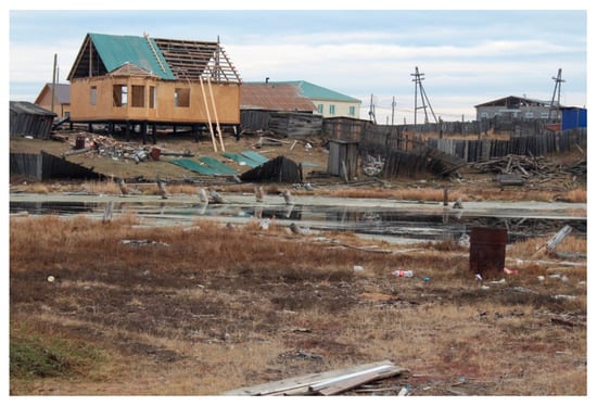 It should be noted that the research on the problem of permafrost degradation and its effect has received a lot of attention in recent years. Focus has been not only rural communities but also urban ones. One of the key works in this field is the research of the Russian-American researcher N.I. Shiklomanov. Academic Shiklomanov has studied potential changes in Russia’s urban permafrost infrastructure, its stability under predicted climatic changes, and the adverse effects manifested by climate change in the Arctic in local urban settlements [,].