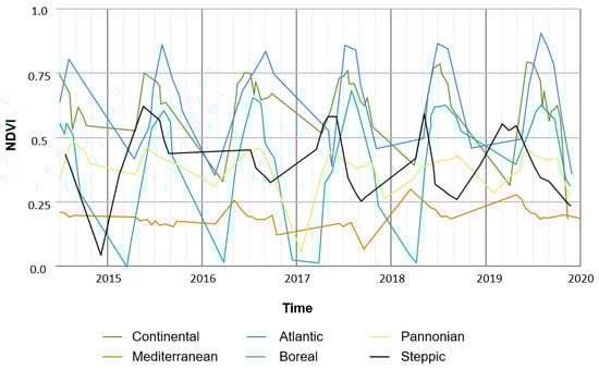 The study area comprised the EU and selected neighboring countries (see Figure 1). Ukraine, for example, was included because of its known potential for underutilized areas, which could be used for the European bioenergy market. The classification was performed in a stratified manner dividing the study area by (1) biogeographical regions of Europe [] provided by the European Environmental Agency (EEA) [], and (2) countries. The first stratification was done due to the different climatic situations throughout Europe, which cause UU land to have very different properties in different regions. The mean annual precipitation plays a significant role here, but the minimum and maximum temperature and the elevation are also important factors. This leads to significant differences in spectral phenological profiles of the same land use class in different regions of Europe, which is also applicable to underutilized lands. Figure 2 shows an example of spectral profiles of underutilized lands for different biogeographical regions. By using biogeographical regions to stratify the classification, these differences are taken into account.