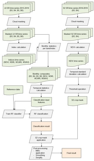 The entire mapping approach is schematically depicted in Figure 4. Classification on a continental scale with high resolution time series data is demanding both in terms of covering all different variations (see Figure 2) as well as in terms of data handling. To facilitate the data handling and processing, the satellite image classification was performed using Google Earth Engine (GEE). GEE is an online cloud-based processing engine for geospatial analyses, available free of charge for research projects. User access is provided through an internet-accessible application programming interface (API) and an associated interactive development environment. Through client libraries available for JavaScript and Python programming languages, it offers all necessary tools for geospatial analyses and visualization (maps and graphs). Since GEE has a wide user group sharing their work, a lot of pre-defined functions and processing workflows are available []. Another reason for GEE’s popularity is the extensive amount of available data easily accessible and ready-to use. Additionally, each user can upload his/her own data sets to a private storage space and integrate them into analyses [].