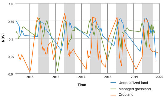 L8 NDVI phenological profiles of cropland (orange), managed grassland (green), and underutilized land (blue) in the Continental biogeographical region. The growing season (beginning of May until end of September) is indicated in grey.
