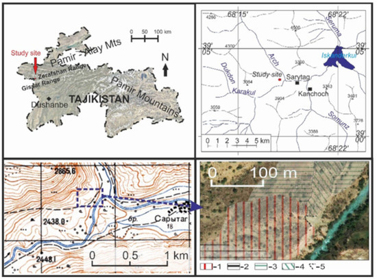The studies were carried out in Tajikistan, in the Pamiro-Alay Mts. (Figure 1), Central Asia. It forms part of the catchment area of the Aral Sea [35], and is, together with the Pamir Mountains, a region that supplies the Zeravshan River [36], a tributary of the Syr Darya River. The study area is located in the valley of Sarytag in the Fann Mountains. The elevation of the research area ranges between 2400 and 2435 m.a.s.l. It is characterized by a typical mountainous terrain, with steep slopes and active morphogenetic processes [37]. The section of the valley studied extends from west to east. This section has a fluvial nature, and the valley bottom is filled with fluvial and fluvio-glacial sediments. There are four distinct levels of terraces, identified as the “20” and “15” m levels occupying a major part of the valley bottom. The region is tectonically active [38]. The nearest weather station is located at Iskanderkul Lake (2204 m.a.s.l., Figure 2), where precipitation amounts to 271 mm/year and the average annual temperature is 6.6 °C [39]. Stations at higher elevations, i.e., Shahristan Pass (3143 m.a.s.l.) and Anzob Pass (3373 m.a.s.l.), have recorded 0.7 °C and −1.9 °C, respectively. During recent decades, an increase in temperature, a decrease in precipitation, and the occurrence of droughts have been noted in this region [40,41].