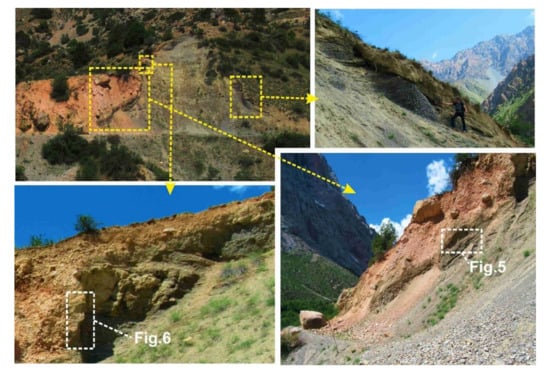 The study site is located in Sarytag Valley, just above its junction with Arch Valley. The Fann Mountains feature a fold structure. The valley section in which the nival deposits are found is built of sedimentary rocks including Devonian limestones, primarily light massive, locally banded, from the most significant relief-forming formation [45] (Vinogradov et al., 1962). Both rock walls, northern and southern, are built of this formation. This is the source area of the rock material for the nival deposits, therefore, these formations are practically homogeneous from the formation composition point of view. The outcrop of subnival sediments is on the edge of the terrace in the landslide niche. The outcrop and slope exposures are to the SE.