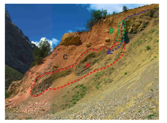 The angled position of layers indicates a depositional environment under the conditions of flowing subnival waters (Figure 4A). Section A of the displaced sediment consists of gravel and stones, as well as a sandy-loamy material. Larger rock clasts are arranged irregularly (Figure 5) and there is no imbrication nor orientation there. Such an arrangement of the layers proves that the material was heavily saturated with water and displaced in a suspended form, and it was not deposited by fast-flowing water, because high energy of water would cause better separation. However, the amount of water causing this process must have been significant, since it enabled such large rock clasts to be displaced.