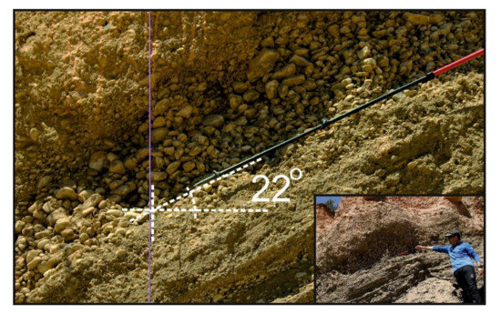 The most interesting aspect is the interaction between the nival and fluvial clasts, which provides evidence of the mechanism underlying the action of subnival waters. Horizontal fluvial sediments of terraces change their dip angle to 22 degrees along with their contact with nival deposits (Figure 4 and Figure 5). The thickness of sediment with a modified dip angle is a maximum of 2.1 m, with this layer consisting of pebbles alternating with gravel and gravelly-sandy-loamy sediments. The sediment layers dip towards the stream bed, with sediments of a nival origin lying above. A change in the dip angle of the terrace layers occurs at a location where the thickness of nival sediments increases rapidly from 0.7 to 2.2 m.