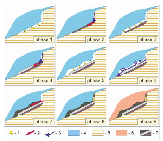 The entire sediment has built up in several stages (Figure 7). The stratification of the sediments indicates that the sediment has formed gradually in cycles, i.e., melting out of a void underneath the snow patch and the void filling up with sediment (Figure 7, phases 1–4). Further research is needed to determine the number of such cycles. If the empty space between the snow patch and the bedrock was created and filled in a single cycle, the oblique sediments would be mixed. Their clear stratification, as well as the extant arrangement of the sediment in the same sequence, clay-sand-gravel, similar to in the adherent terrace layers, indicates that each clast has been formed as a result of a different melt-filling cycle. During the last cycle of melting and filling in section A (as in Figure 4) subnival waters were under hydrostatical pressure (phase 5, 6, and 7). Once section A of the hollow had been filled, the outflow of subnival water was blocked (Figure 7, phase 7), which led to the filling of the bottle neck with deposits, during two or three events (Figure 7, phase 8). The last stage of the formation of the sediment involved the melting of the whole snow patch and the formation of post-nival sediments (Figure 7, phase 9).