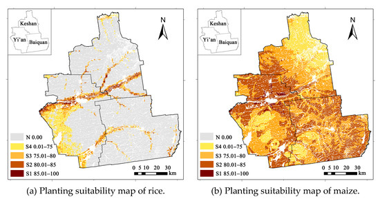 The suitability results for maize showed that almost all cultivated land in the study area is suitable for cultivating maize. The suitable (S2) and moderately suitable (S3) areas for cultivating rice is 6636.15 km2 (79.88%), which accounts for the highest proportion of cultivated land area in the region. Only 1.19% (99.10 km2) of the cultivated land were classified as highly suitable (S1), and the marginally suitable (S4) area is 1572.16 km2, accounting for 18.93% of the cultivated land area in the region (Table 3). The land suitability map for maize (Figure 3b) showed that the best areas for cultivating maize (S1-S2) are concentrated in the north of Yi’an County and southwest of Keshan County, and scattered in the south of Yi’an County and Baiquan County. Areas that are moderately suitable (S3) are mainly distributed around the suitable (S2) area, and the two occupy a similar proportion of cultivated land. The marginally suitable (S4) area is mainly located in the northern of Keshan County, south of central Yi’an County, and southwest of Baiquan County. Keshan County is less suitable for maize cultivation among the three counties, and nearly half of the area is marginally suitable (S4) area. According to the distribution characteristics of land suitability of maize, the main limiting factors for maize planting are climate and soil. Compared with rice and soybeans, maize cultivation has higher requirements for mean daily temperature and accumulated temperature.