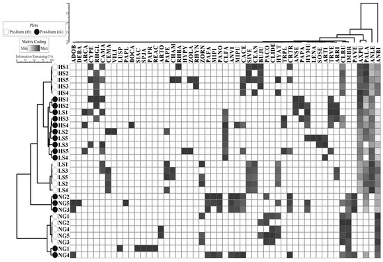 Two-way hierarchical cluster dendrogram showing the composition of vascular plant species (columns) in each plot for different grazing treatments (rows), for the pre- (t0) and the last post-burn (t4) surveys. Greyscale of squares represents the gradient in vegetation cover (%), where white squares indicate the absence of the species, and dark grey indicates the maximum cover range (75%–100%, e.g., for Andropogon bicornis in NG1). NG = non-grazed, LS = low stocking rate, HS = high stocking rate. Species codes appear in Table S1.