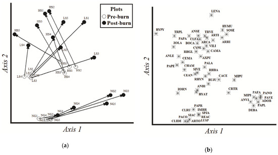 Plot (a) and plant species (b) ordination by non-metric multidimensional scaling (NMDS) based on a matrix of vascular plant species cover, comparing the pre- (t0) and the last post-burn (t4) surveys in every grazing treatment. Vectors show the magnitude and the direction of changes between times for the same plot. NG = non-grazed, LS = low stocking rate, HS = high stocking rate. Species codes appear in Table S1.