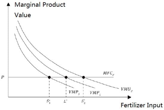 Taking into account the factor market, under equilibrium conditions, the marginal value of each product factor input by farmers must be equal to the price of the factor, and the marginal value of the product factor is equal to the multiplication of marginal output and the price, so as the input of factors increases, the marginal value of the product diminishes. Figure 1 indicates the relationship between fertilizer input and marginal product value. When other factor inputs remain unchanged, increasing chemical fertilizer input will result in a decrease in the output of the marginal product value of crops. Suppose that the marginal product output value curve of large-scale households is and the fertilizer price at the market is , the optimal fertilizer input for large-scale households should be . However, in reality, the actual application amount of chemical fertilizers for large-scale households may be higher than this optimal value because chemical fertilizer application has a practical problem that is different from the general agricultural input of elements. Fertilization application is closely related to the original soil fertility and the content of chemical fertilizers. Farmers in China often have insufficient knowledge of soil fertility and fertilizer nitrogen, phosphorus, and potassium content information, and large-scale households are no exception, especially large-scale households whose main land is rented from the government, and even have less information regarding the land than ordinary households. Therefore, due to risk aversion considerations, both large-scale and small-scale households may have a tendency to apply more fertilizers [30,31,32].