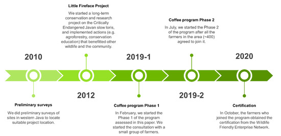 | Education and wildlife conservation | 1. Between 2014 and 2019, the Little Fireface Project delivered several conservation education programs meant to increase knowledge about wildlife, with a particular focus on the Critically Endangered Javan slow loris [27]. 2. Thanks to the work of the Little Fireface Project, the hunting and trapping activities were already reduced, and hunting and trapping in the area was very limited. | 1. We delivered a specific program with schools in the village and neighboring areas to promote the importance of wildlife in coffee plantations. 2. During the meetings with the farmers, we consistently emphasized the importance of wildlife in coffee plantations and the benefits of having shade trees and pollinators. 3. The farmers suggested that a local law (i.e., a community agreement with fines for offenders) would be a good solution to stop the limited hunting and trapping activities in the area. | 1. We organized a regional workshop with farmers from West and Central Java, representatives from the Government, NGOs, and academics working on sustainable farming production (>160 participants). 2. The local law banning hunting activities was approved in January 2020 and the community wanted also to address the issue of waste management in the law. Therefore, a littering ban is now in place and a waste management plan is in development. We placed a large sign to the entrance of the village and 15 medium signs at the entrance of each unpaved road used to access the agroforestry area. |