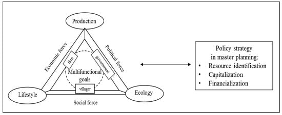 Based on these findings, our analysis framework of multifunctional goals is related both to multinational land-use with sustainability and diversified stakeholder benefits and rights [,] (Figure 1). Scholars have found that friendly public–private partnerships helped in the development of land-management processes [,,]. Based on this study, we believe that the optimized mode and regulation policies for the multifunctional evolution of rural land need to be further investigated, covering more stakeholders. First, the government plays a leading role in master planning and should take responsibility in the form of coordinating the attraction and stimulation of diverse stakeholders to join in with rural revival. Some scholars have revealed the planning policies of “building a new countryside” and “increasing vs. decreasing balance”. As such, land-use policy has made a great impact on rural spatial transformations [,,]. With China’s distinctive political and land-use system context, there is no doubt that government needs to take a leading role in developing multifunctional land-use goals during master planning. Second, bottom-up initiatives, including rural cooperation and collective organization, need to be unified and integrated into the alliance as a whole. Rural restructuring is a dynamic and hybrid process, strongly shaped by local power and local villagers. The strong “voices” from local stakeholders are an essential part of master planning []. Third, firms including manufacturing, service firms, and real estate should be motivated to develop actionable strategies [,]. Firms are high-efficiency actors in the market, connecting governmental and social forces. To summarize, to integrate the top-down and bottom-up approaches into rural revival is to coordinate various stakeholders from the government, firms, and villagers towards the achievement of multifunctional sustainability goals.