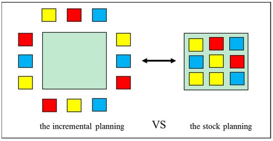 The first phase towards multifunctional land-use in the current master plan was to identify potential stock land resources in terms of social, cultural, economic, and ecological functions instead of merely economic functions. Based on a contextual analysis of previous plans from 2004 and 2007, we found that their main policies preferred the incremental transformation of construction land to develop manufacturing industry, as this was a priority in Lijia. In contrast to previous incremental plans, the current master plan tends to represent a new method of stock planning (Figure 3), which emphasizes the improvement of land-use efficiency and the renewal of abandoned rural areas for social, cultural, economic and ecological progress. Therefore, this changed the priority label and added the characteristic of “green innovation town” to Lijia.