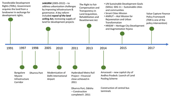 Over the years, project proponents have attempted to leverage the potential upside from increased land value due to infrastructure developments and have structured these increases as a source of revenue for the project. The project structures have attempted to balance concerns of the community and the political class pertaining to displacement and inequity. The history of policies, schemes, and laws also indicates an implicit real estate turn in the development landscape, as was witnessed in other Asian countries [14]. The following Figure 1 presents a timeline of the key projects and the policies, legislations discussed in the preceding sections.