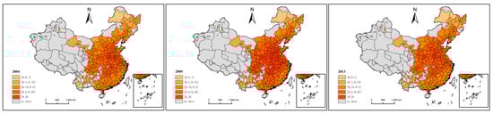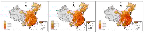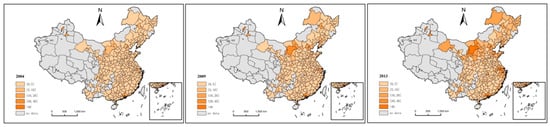 Figure 3 shows the spatiotemporal distribution of borrowing advanced functions by prefecture-level cities in the study area in 2004, 2009, and 2013. It can be seen that the number of prefecture-level cities with higher levels of borrowing advanced functions has declined, then increased, and then declined again. This has mainly been caused by the relative strength of the high-end service industry and the manufacturing industry. It is well-known that the global financial crisis triggered by the subprime mortgage crisis in the United States in 2007 had a dramatic impact on industrial development worldwide. The crisis caused a substantial reduction in the orders of China’s exporters, which in turn led to business closures, bankruptcies, and mass layoffs. When facing a financial crisis, the general manufacturing industry is more vulnerable than the high-tech industry []. Therefore, in 2009, when the advanced functions of the prefecture-level cities were larger, the advanced functions that could be borrowed were also larger. By 2013, following the recovery of the global economy and China’s emphasis on the development of the real economy, even though the high-end service industry had recovered to a certain extent, it remained relatively weak compared with the manufacturing industry. Thus, borrowing advanced functions by prefecture-level cities remained lower in 2013 than in 2009.