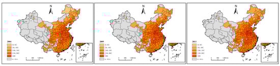 Figure 1 shows the spatiotemporal distribution of nighttime lighting density in the prefecture-level cities studied in 2004, 2009, and 2013. In the figure, the areas with higher levels of nighttime lighting brightness per capita are mainly distributed in economically developed areas or areas with an average level of economic development and relatively small populations. For example, in 2004, the only prefecture-level cities with a per capita nighttime lighting brightness DN value of more than 20 units were Shenzhen, Dongguan, Jia Yuguan, and Karamay, with the first two cities located in economically developed regions and the other two in regions with relatively small populations. By 2009, Zhongshan City, Foshan City, Shenzhen City, Wuhai City, and Ordos City were included in the list of cities with a per capita nighttime lighting brightness DN value exceeding 20 units. By 2013, the number of prefecture-level cities whose per capita nighttime lighting brightness DN value exceeded 20 units had increased to 15. From the spatial perspective, cities with high levels of per capita nighttime lighting brightness tend to be distributed in coastal areas, the middle and lower reaches of the Yangtze River area, and the Bohai Bay area, which is basically consistent with the economic development levels of China’s small and medium-sized cities.