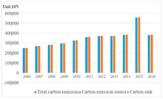Through calculation, the carbon emissions, carbon sources, and carbon sinks of different land use types in China from 2006 to 2016 were obtained. The results show that, from 2006 to 2016, China’s land use carbon emissions continued to grow, and its development went through three stages (Figure 1). From 2006 to 2011, the carbon emission of land use increased gradually from 248,128.744 × 104 t to 368,449.183 × 104 t. From 2011 to 2015, it was initially stable then quickly jumped to 554862.714 × 104 t. From 2015 to 2016, it decreased greatly to 379,797.774 × 104 t. During this period, carbon sources, carbon sinks, and average carbon emissions continued to rise, rising from 250,403.748 × 104 t to 382,237.248 × 104 t, 2275.005 × 104 t to 2439.474 × 104 t, and 8270.958 × 104 t to 12,659.926 × 104 t, respectively.