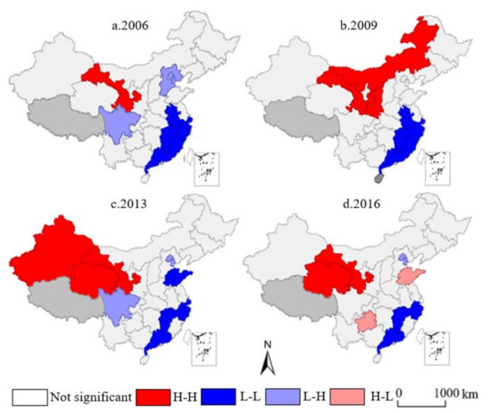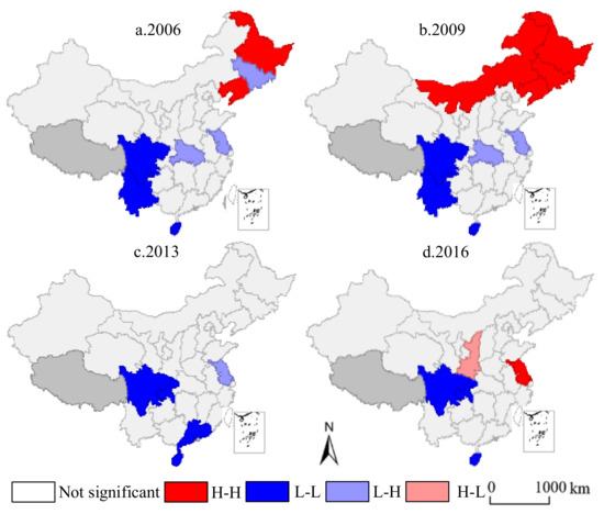 The LISA spatial agglomeration pattern of carbon emissions per capita on land use in typical years in China: 2006, 2009, 2013, and 2016.