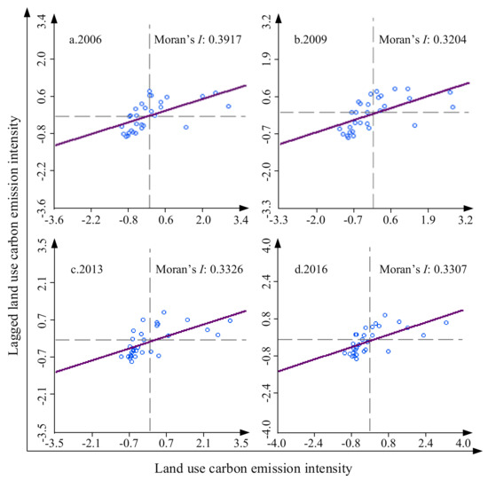 The Moran scatter diagram of carbon emission intensity on land use in China in typical years: 2006, 2009, 2013, and 2016.