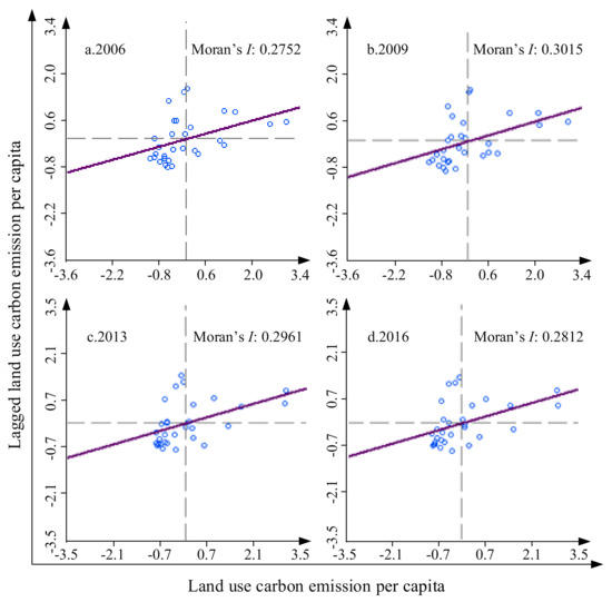 The Moran scatter diagram of carbon emission per capita on land use in typical years in China: 2006, 2009, 2013, and 2016.