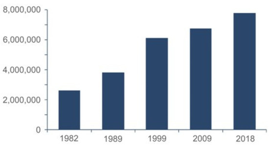 In Catalonia there are more than 7.7 million pigs (piglets, pigs for fattening and for breeding) and in 36 years (1982–2018) the number of pigs has almost tripled (298%) (Figure 1). Catalonia is one of the countries with the highest density of pigs, with 242.27/km2, surpassed only by the Netherlands, with 290.54/km2, and Denmark, with 294.91/km2.