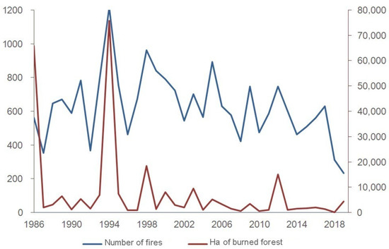 Evolution of forest fires in Catalonia (1986–2019). Source: Government of Catalonia. Department of Agriculture, Livestock, Fisheries, and Food. Directorate-General of Forest Ecosystems and Environmental Management. Forest Fire Prevention Service.