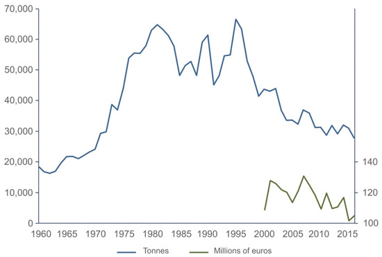 Figure 3 shows the evolution of total catches since 1960, which marked the beginning of a remarkable surge promoted by the implementation of favorable policies during the 1970s. After a period of growth and then fluctuations, typical of phases of overexploitation, since 1996 catches have steadily declined. In 2018, 27,225 tonnes were caught according to data from the Directorate-General for Maritime Affairs and Fisheries. While fleet numbers have declined in the 21st century, it must also be said that their extractive capacity has increased due to the technological advances and new materials used by fishing boats.