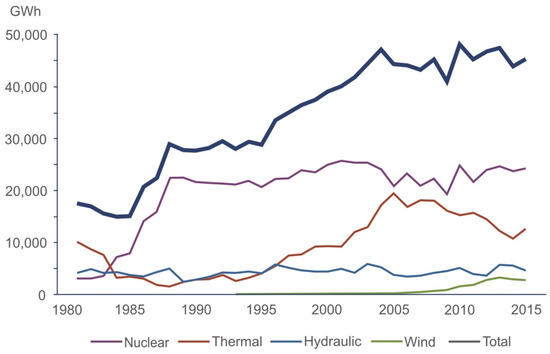 The increase in energy consumption caused by the urbanization process in Catalonia can be seen in the graph below (Figure 4) [21]. It shows the evolution of electricity consumption by type of energy source between 1981 and 2015. Only 22% of the total electricity consumed came from renewable sources.