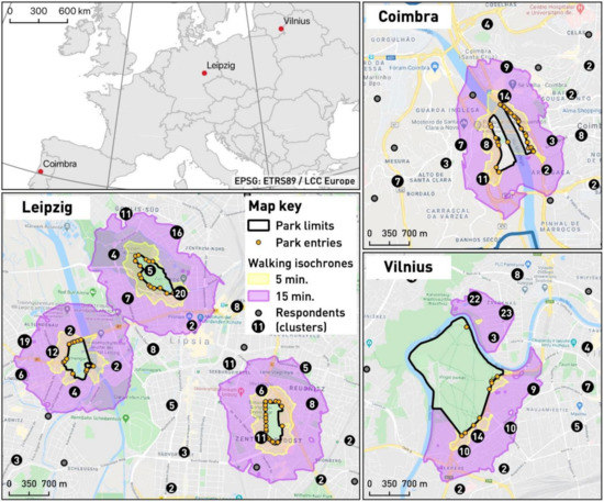 Most citizens in all three cities used individual transportation to reach the parks, and only a minority used public transport (ranging from 6% in Coimbra to 10% in Leipzig and Vilnius). Walking was the dominant way of accessing the parks in the three cities, but with a significant difference between Leipzig—almost 70% of users arrived by foot—and the other two cities—less than 50% arrived by foot. Chi-square test reveals significant differences in means of transport specified by respondents (p < 0.001). The number of people arriving by car was considerably higher in Coimbra, while the number of people arriving by foot or bike was much lower compared to the other cities (see Pearson’s residuals in Supplementary Materials Table S2). Mostly cars were used to cover larger distances, followed by public transport, being the second most common means of transportation, although only 7% of the users in Leipzig arrived by car, compared to 28% in Vilnius and 46% in Coimbra. A very prominent difference between cities was bikers, mostly absent in Coimbra (0.3%), but representing considerable proportions of users in Leipzig (14%) and Vilnius (13%). Non-motorized means like bikes and walking were mostly used for distances up to 5 km, walking dominating up to 900 m, corresponding to 15-min walking time (see Figure 1 for 5-min and 15-min walking isochrones). See Supplementary Materials Figure S1.