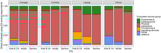 Physical interactions were the predominant ES use in all age groups across the three European cities (Figure 2): the highest degree was seen in Coimbra, followed by Vilnius and Leipzig. In Coimbra mainly younger people were interested in aesthetical use, contrasting the mainly older proportion of park users in Leipzig and the young and older in Vilnius. A third group comprising provisioning and regulating ES was mainly used by young and middle-aged citizens in Leipzig, but almost neglected by elders and not used at all in the other cities. In all three cities, younger people reported park use for social relations much more often than adults and older persons.