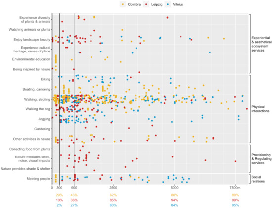 Travel distances of park users showed differences and common patterns between ES uses as well as between cities. A Kruskal–Wallis test showed a significant difference between cities (p < 0.001) in the average distances travelled. Pairwise comparisons show that respondents from Vilnius travelled significantly larger distances than visitors in Leipzig and Coimbra. In Coimbra and Leipzig, at least one-third of visitors travelled 900 m or less, while in Vilnius most park users travelled 0.9 km to 5 km. At least 60% of visitors in all three cities travelled up to 2.5 km, while at least 90% travelled up to 5 km to reach their destination. At the ES level, differences were analysed qualitatively because several ES were either not relevant in all cities (e.g., environmental education, gardening) or had numbers too low for statistical analysis (e.g., diversity of plants or inspired by nature). For most ES uses, including major activities such as walking (the dog), Vilnius and Leipzig visitors seemed to prefer short distances (Figure 3). Citizens seeking noise reduction, enjoying landscape beauty or gardening travelled larger distances in Leipzig, similar to citizens enjoying physical interaction or seeking social relations in Vilnius.