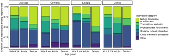 Overall, the most frequent motivation was proximity (close to home or accessible) mentioned by young and adult Leipzig park visitors, and by seniors in Vilnius. The availability of physical space for activities motivated more younger than older users, while for motivations related to nature, landscape or wilderness, it was the other way round, that is, older visitors were a lot more motivated by these aspects. The chi-square test confirms these findings with significant results (p < 0.001), showing highest variation between age groups for the two motivation categories “nature, landscape or wilderness” and “physical space for activities” (Supplementary Materials Table S4). The motivation “tranquillity or seclusion” seemed to be important for adults and seniors in Vilnius and Leipzig, but less in Coimbra. The authors were surprised that the motivation “social or cultural interaction” played a minor role for young adults and adult visitors (except for young adults in Vilnius) and was almost neglected by seniors.