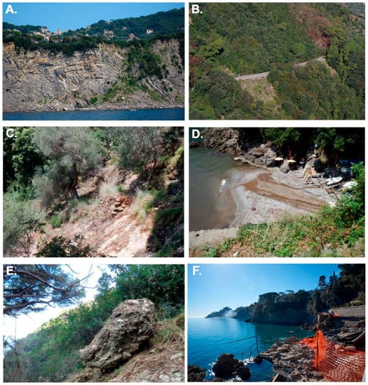 - Brandolini, P.; Faccini, F.; Robbiano, A.; Terranova, R. Geomorphological hazards and monitoring activity along the western rocky coast of the Portofino Promontory (Italy). Quater. Int. 2006, 171–172, 131–142. [Google Scholar] [CrossRef]