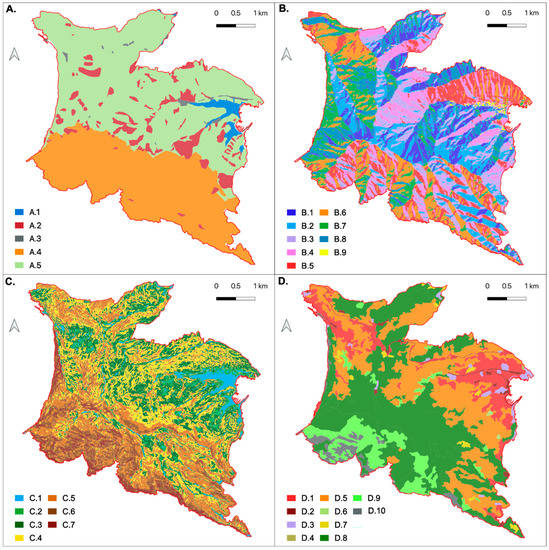 Shallow landslides predisposing factors. (A) Lithology: 1. Heterogeneous clayey and sandy materials (Alluvial deposits); 2. Incoherent soils, including silt and clay with granular fraction and coarse soils (Slope deposits); 3. Heterogeneous materials of anthropic origin (Fills and artificial deposits); 4. Marly limestone and marls (Flysch of Monte Antola); 5. Conglomerate (Conglomerate of Portofino). (B) Slope aspect: 1. North; 2. North-East; 3. East; 4. South-East; 5. South; 6. South-West; 7. West; 8. North-West; 9. Zenith. (C) Slope steepness: 1. 0–10%; 2. 11–20%; 3. 21–35%; 4. 36–50%; 5. 51–75%; 6. 76–100%; 7. >101%. (D) Land use, based on the 2° level of CORINE nomenclature (European Environmental Agency, 1995): 1. Urban fabric; 2. Industrial, commercial and transport units; 3. Artificial, non-agricultural areas; 4. Arable land; 5. Permanent crops; 6. Pastures; 7. Heterogeneous agricultural areas; 8. Forests; 9. Shrubs and/or herbaceous vegetation association; 10. Open spaces with little or no vegetation.