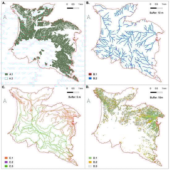 Shallow landslides predisposing factors. (A) Terraces: 1. Terraced area; 2. Non-terraced area. (B) Distance from hydrographic network (buffer zone = 10 m): 1. Springs; 2. Watercourses. (C) Man-made cuts (buffer zone = 5 m): 1. Main road network; 2. Minor road network; 3. Trail network. (D) Man-made structures (buffer zone = 10 m): 1. Buildings; 2. Other manufacts; 3. Retaining walls.