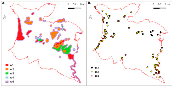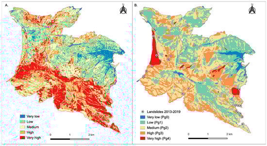 We also considered the presence of pre-existing landslides, which may represent areas with a potential higher proneness to slope instability. These instability processes derived from the regional catalogue of landslides at 1:10,000 scale [] (Table 1), in which landslides are mapped and classified on the basis of type of movement and state of activity. In particular, we considered four classes: (i) active/reactivated/suspended landslides, (ii) dormant landslides, (iii) inactive/stabilized landslides, and (iv) area affected by widespread shallow landslides. In stable areas, certainly or supposed, we set two further classes based on a buffer zone of 50 m from the boundaries of mapped landslides (Figure 5A).