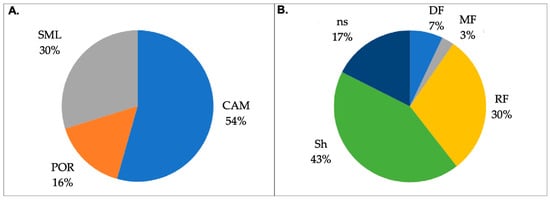 (A) Distribution of rainfall-induced shallow landslides in the Portofino promontory: CAM, Camogli municipality; POR, Portofino municipality; SML, Santa Margherita Ligure municipality (for location, see Figure 1). (B) Type of rainfall-induced shallow landslides within the Portofino promontory: DF, debris flow; MF, mud flow; ns, not specified; RF, rock fall; Sh, shallow landslide.