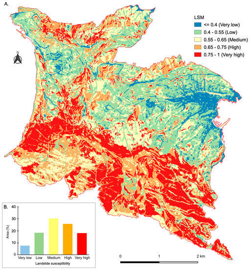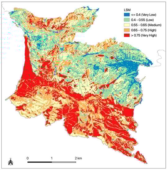 Combining weightage of conditioning factors and their classes, we obtained the landslide susceptibility map of the Portofino promontory. We normalized the resulting LSM values, which ranged from 0.079 to 0.401, by scaling values between 0 and 1. In order to determine the class intervals in the obtained map, we took into consideration the classification systems commonly applied in landslide susceptibility zonation: natural breaks, quantiles and equal intervals []. On the basis of the raster map histogram, which is multimodal and shows empty class intervals, we adopted the natural breaks method to divide the LSM values into five classes shown in Table 6. In this case, the quantile classification is not appropriate because data are not linearly distributed; whereas the lowest susceptibility class is too emphasized relative to others using equal intervals.