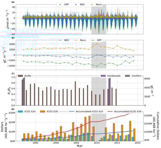 (A) Hourly NEE (blue), GPP (green), and Reco (orange) for the period 1992 to 2019. (B) Same as (A) shown as yearly sums. (C) Soil respiration (Rs) divided by Ecosystem Respiration (Re) yearly values (Brown) and total soil carbon measured in the top 15 cm of the mineral soil of the hardwood- (purple) and conifer- (grey) dominated plots from [6]. (D) CO2 yearly sequestration value in U.S dollars ($) assuming a ton of CO2 were worth $10 (light blue bars) or $30 (orange bars), and their accumulated values (blue and red lines respectively) extrapolated to 40,468 ha (100,000 acres), based solely on numerical projection to illustrate potential project revenue with increasing land area, assuming there were no exits during the interval 1992–2019. Further details of this calculation are available in Appendix A. The period 2009–2012 is highlighted with a grey shade to illustrate status of variables resulting in large financial loss for the interval.
