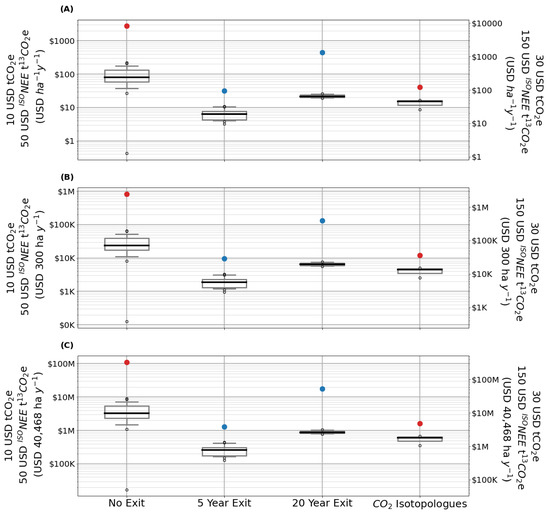 Yearly financial CO2 and 13CO2 (or 12C18O16O) box plots with median (black line), first and third quartiles (box), 5 and 95 percentiles (whiskers) and outliers (circles) per ha (A), extrapolated to Prospect Hill area (300 ha; (B)) and extrapolated to 40,468 ha (100,000 acres; (C)), based solely on numerical projection to illustrate potential project revenue with increasing land area, in logarithmic scale. The red points are accumulated values over the whole period; blue points are mean accumulated values at the end of exited projects (5 or 20 years, respectively). Left and right y-axis show different pricing scenarios (left: a ton of CO2 is worth $10 and a ton of 13CO2 (or 12C18O16O) $50; right: a ton of CO2 is worth $30 and a ton of 13CO2 (or 12C18O16O) $150).