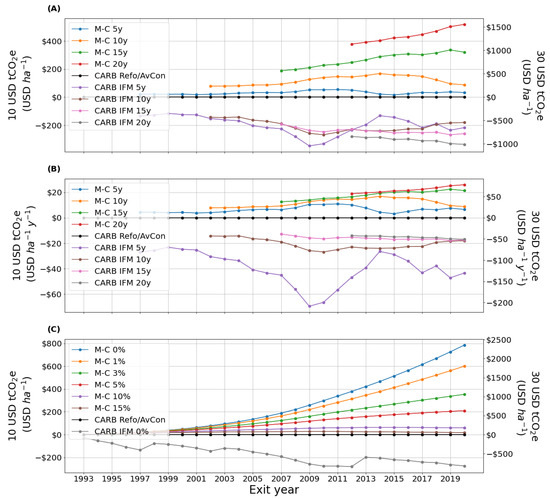 The M-C ton-year accounting method, supposing , was used to explore 5, 10, 15 and 20 years exit options profitability, along with Net Present Value calculations (NPV; Equation (6).) of a hypothetical project that started in 1992 and finished at any year, discounted at 0%, 1%, 3%, 5%, 10%, 15% discount rates. These results were compared with the same projects but compensated with the California Air Resources Board (CARB) protocol. Also, they were extrapolated to a hypothetical 40,468 ha (100 k acres) land and the Prospect Hill area (300 ha; 741 acres), while different carbon price scenarios were applied ($10 or $30 a tCO2e) to analyze the financial value of both lands.