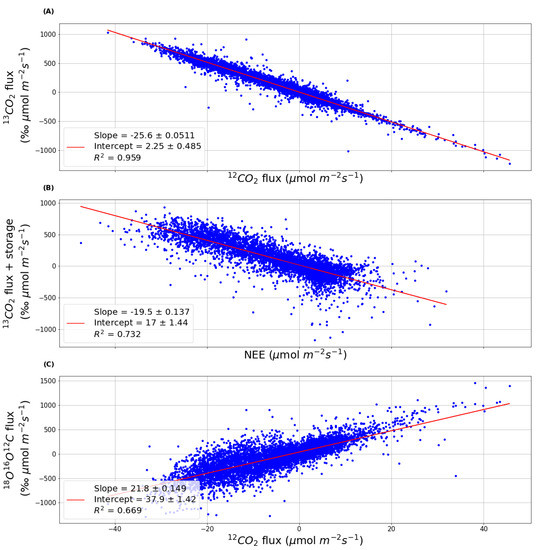 CO2 isotopocule data, (A) shows the non-gap filled 13C16O2 data plotted against NEE determined using 12C16O2 data (“hf209-10” dataset) between April and October from 2011 to 2013; (B) shows 13C16O2 data aggregated to be plotted against NEE from the “US-Ha1 28-years” dataset; (C) shows the non-gap filled 18O12C16O data plotted against NEE 12C16O2 non-gap filled data.