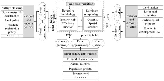 Land-use transition always happens within the three-fold framework of natural systems, economic and social systems, and institutional systems [15]. Suburban villages are subject to the joint impact by both rural and urban–rural systems due to their special geographical location—on the margin of a city [30]. There are three major factors driving rural land-use transition: First, national and regional policies. By implementing various strategies at different levels including land policies, village planning, household registration policies, etc., governments can impose control on the direction and mode of land-use transition. However, it is hardly feasible to make any adjustment due to its comprehensiveness, thoroughness, high efficiency, and coerciveness [31]. Second, the rural endogenous power. With various factors, including natural resources, cultural characteristics, population growth, and income levels, such factors can indirectly affect the process and results of land-use transition through the behavioral decisions made by subjects of land use, which have a certain degree of fixity and uncontrollability. As a leading factor in rural land-use transition at a certain stage, this second driving force features notable characteristics in each stage in terms of intensity, scope, and duration. Third, the radiation and diffusion of cities. Consisting of the land market, economic development level, locational conditions, market demand, technological progress, and other factors, these driving forces have, directly or indirectly, changed the use of rural land through investment in rural space or the transmission of market demand. With the advancement of the rural development stage, the impact intensity of such driving forces has been further strengthened and has become a key factor for the development of tourism-oriented villages. In addition, land-use subjects, such as ordinary farmers, rural organizations, business enterprises, and urban residents, play a dominant role in rural land-use transition by using and combining various factors that can deliver impact on land-use transition. Simply put, all these factors interact to determine the degree of rural land-use change, as well as the direction and speed of transition (Figure 1).
