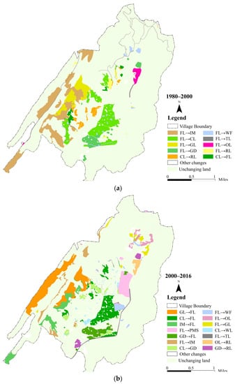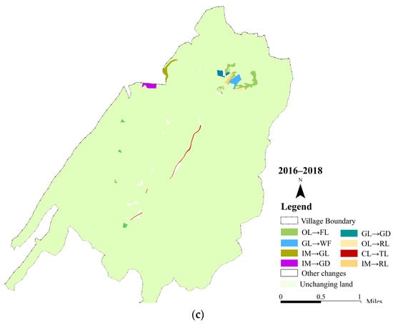 Before 1980, given the restrictions imposed by the planned economy and production factors, such as capital, the land-use structure in the village was mainly based on agricultural land, such as forest land and cultivated land, supplemented by construction land, such as industrial and mining land and residential land. Over the last 40 years or so, She Village witnessed a rapid transformation of land-use quantity and spatial structure (Table 1, Figure 3 ). ① During 1980 to 2000, the land use change of She Village mainly featured the conversion between forest land and other land-use types. The proportion of forest land decreased by 13.81%, while that of cultivated land, grassland, and industrial and mining land increased by 3.73%, 2.33%, and 7.13%, respectively. Residential land and grassland increased by 25.45 hm2 and 25.84 hm2, with an amplification rate of 231.79% and 147.50%. The area of the remaining land-use types all increased slightly. Forest land had the greatest total land-use change of 317.75 hm2, and was the only land-use type with a reduction in net change, mainly transferring to industrial and mining land, cultivated land, and grassland by 120.34 hm2, 84.14 hm2, and 36.80 hm2, respectively, with an account for more than 75% of the total reduced area of forest land. Moreover, the swap change of construction land consisted of residential land, commercial and service facility land, industrial and mining land, public management service land, and transportation land was 0, while net change increased, which indicated the accelerated expansion of village in the study area. ② During 2000 to 2016, land-use change was contrary to the previous stage, but the internal conversions between land-use types were more complex. Forest land increased by 5.48%, while cultivated land, grassland, and industrial and mining land decreased by 5.27%, 0.32%, 4.49%, and 1.26%, respectively. Residential land continued to grow, mainly occupying forest land, garden land, and other land, with an increase of 25.26 hm2. Due to the allotment of the collectively owned land, 29.71 hm2 of forest land were transferred into public management service land which had an explosive growth. Forest land was still the land type with the greatest total change—the area transferred to 206.11 hm2 from 112.47 hm2. It is worth noting that the swap change of other land was 20.15 hm2, accounting for 91.05% of the total land-use change. The swap change was similar to the total land-use change, which means that a large number of spatial location shifts had taken place in the case of a small change in the total amount of other land. ③ During 2016 to 2018, the land-use structure of She Village tended to be stable, and slight changes happened in different land-use types, mainly concentrated in the north of the study area. The main changes were the decrease of 7.06 hm2 and 9.92 hm2 of industrial and mining land and other land, and the increase of 7.8 hm2 of forest land mainly transferred from other land, accounting for 85.28% of the area converted to forest land. On the one hand, the net change of garden land and grassland increased, and there was a certain amount of swap change on the other hand, and the swap change was large, which indicated that the garden land and grassland mainly changed in location. The commercial and service facility land, by continuously replacing or recombining industrial land and residential land, expanded to14.19 hm2, with a growth rate of 55.93%, thus leading to commercial–residential mixed and industrial–commercial mixed land-use patterns, and the diversified land-use characteristics (Table 2).