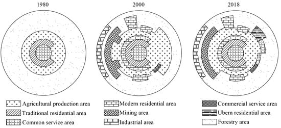 The diversification of land-use types and quantity structure led to the change of spatial layout. The village is located between two mountains and surrounded by vast forests and farmland, forming a ladder layout composed of houses, streets and alleys, reservoirs, farmlands, and mountains (Figure 4). ① In 1980, the spatial layout of land-use in She Village consisted of public management service land, residential land, cultivated land, and forest land from center to edge, forming a concentric circle structure of “public service area—traditional residential area—agricultural production area—forestry area”. Pan’s ancestral hall, Pan’s ancient building complex, and Jiulong ridge, together, constituted the center of the rural settlement in She Village, among which the ancestral hall had the function of public service by providing office space for the village committee. The traditional residence maintained an ancient style of cyan bricks and black tiles, extending to the south and north from the center of the settlement, and connected to the reservoir. The periphery of the traditional residence was contiguous cultivated land, garden land, and forest land. She Village presented a centralized layout pattern with a compact internal structure. Buildings were distributed along contour lines, high in the north and low in the south, and formed a diverse spatial layout together with the latticed streets and lanes. ② In 2000, rapid industrialization led to an explosive expansion of the industrial and mining land. Eight industrial and mining enterprises were put into operation in She Village over the past two decades, which formed an industrial belt along Huanglong and Qinglong Mountain on the west side of She Village and occupied a large expanse of agricultural space. The development of mining industries caused degradation of forests and the increasing area of bare mountains, which further squeezed the space for agricultural production eastward. Significant changes also took place in the internal structure of agricultural land, where the cultivated land expanded eastward, occupying the original forest land, and creating a new fan-shaped area eastward based on the original ring structure. In the late 1990s, with the population growth and households division, a vast expanse of residential land increased. Modern residences expanded along the periphery of traditional ones, gathering together at each node of the road network. Also, they were distributed in a discrete way, breaking the tight spatial layout of the village. During this period, the spatial change of land use in She Village featured the establishment of industrial areas, expansion of mining areas, scattered growth of residential areas, and the emergence of a small portion of commercial land, contributing to the more mixed spatial layout of She Village. ③ In 2018, after ecological restoration and the development of the tertiary industry, the spatial layout of land use was further diversified. Through the listing and auction of land parcels, urban residential land emerged and squeezed part of the agricultural production area and forestry area. Forest area was restored in the east of the village after the policy of Grain for Green came into effect, and the mining land, once occupied forests and farmland, was shrunk with the implementation of the comprehensive rehabilitation of mining area. The space for agricultural production tended to be contracted, fragmented, and decentralized. Currently, the layout of She Village is a concentric circle structure, with public service facilities as the core, traditional and modern residences as the inner circle, agricultural production areas as the intermediate circle, and forestry and industrial areas as the outer circle. Commercial service areas, part of modern residential areas and public service areas, have replaced part of agricultural production area and are distributed between the agricultural circle and the forest circle along the rural road, in the form of clumps (Figure 4). During the construction of demonstration villages, She Village repaired and protected historic buildings and demolished the sheds, toilets, and temporary houses etc., which were done by villagers privately. The internal structure of the village was upgraded by optimizing the rural road network system and strengthening the bonds between primary and secondary roads.