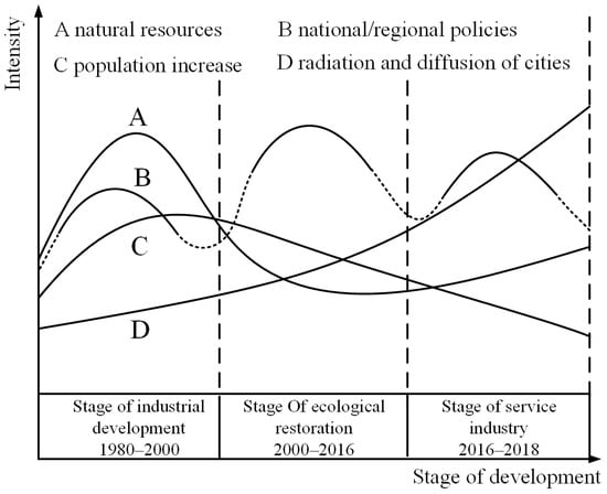 Over the past four decades, the dominant factors driving rapid land-use transition in She Village were different at each stage. The land-use transition during the stage of industrial development was driven by natural resources and population growth; during ecological restoration, driven by the national macro policies and the transfer of urban functions; and during service industry development, driven by market demand, location advantages, regional policies, and the interaction between various subjects of land use. The national and regional policies played a decisive role in the two periods of transformation and development of She Village. Different driving forces had different impact intensities at each stage of the land-use transition of She Village. Natural resource, urban radiation and diffusion, population growth, and national and regional policies showed four changing trends of periodically intermittent, increase–increase–increase, increase–decrease–increase, and increase–decrease–decrease, respectively.
