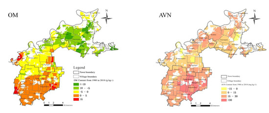 During 1980–2010, the overall AVN content showed a trend of first decreasing and then sharply increasing, it slightly declined from 109.38 mg/kg in 1980 to 108.36 mg/kg in 2000 and then rose to 126.80 mg/kg in 2010 (see Table 1 and Table 2, Figure 4 and Figures S1 and S2). In 1980, AVN mainly distributed in Grade III (120–135 mg/kg), Grade IV (105–120 mg/kg) and Grade V (90–105 mg/kg), accounting for 13.6%, 39.1% and 47.3% of the total area, respectively. By 2000, AVN is mainly characterized as Grades IV and V, accounting for a total area of 57.0% and 37.3%, respectively. Compared with 1980, AVN content in the study area generally rises by 0–15 mg/kg in Linhu street, the eastern Wanggangbao town, and the central and middle Yongle town. Area with a decline of AVN was located in the middle and western Wanggangbao town. In the western Wanggangbao, the decrease of AVN was more than 15 mg/kg. By 2010, AVN was mainly dominated by Grades III (60.1%) and IV (23.6%). Compared with 2000, the AVN content in most areas rose by 0–15 mg/kg and by 15–30 mg/kg. It increased more in Wanggangbao town and Yongle town than in the Linhu street. Compared with 1980, the increase of AVN ranged from 0–15 mg/kg to 15–30 mg/kg in Yongle town. Within Yongle town, it rose by 15–30 mg/kg in the north, and 0–15 mg/kg in the central and southern parts. The increase of AVN in some areas of Yongle town even exceeded 30 mg/kg.